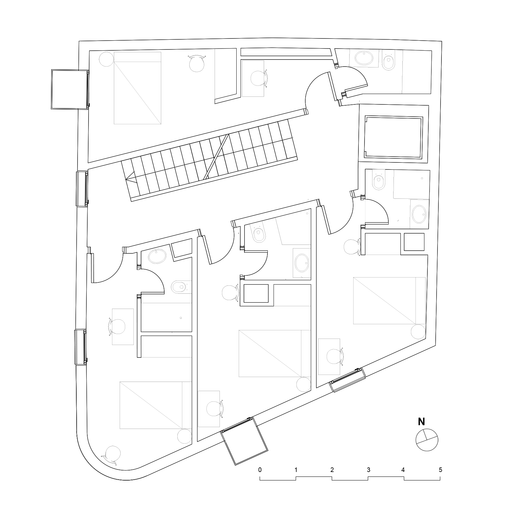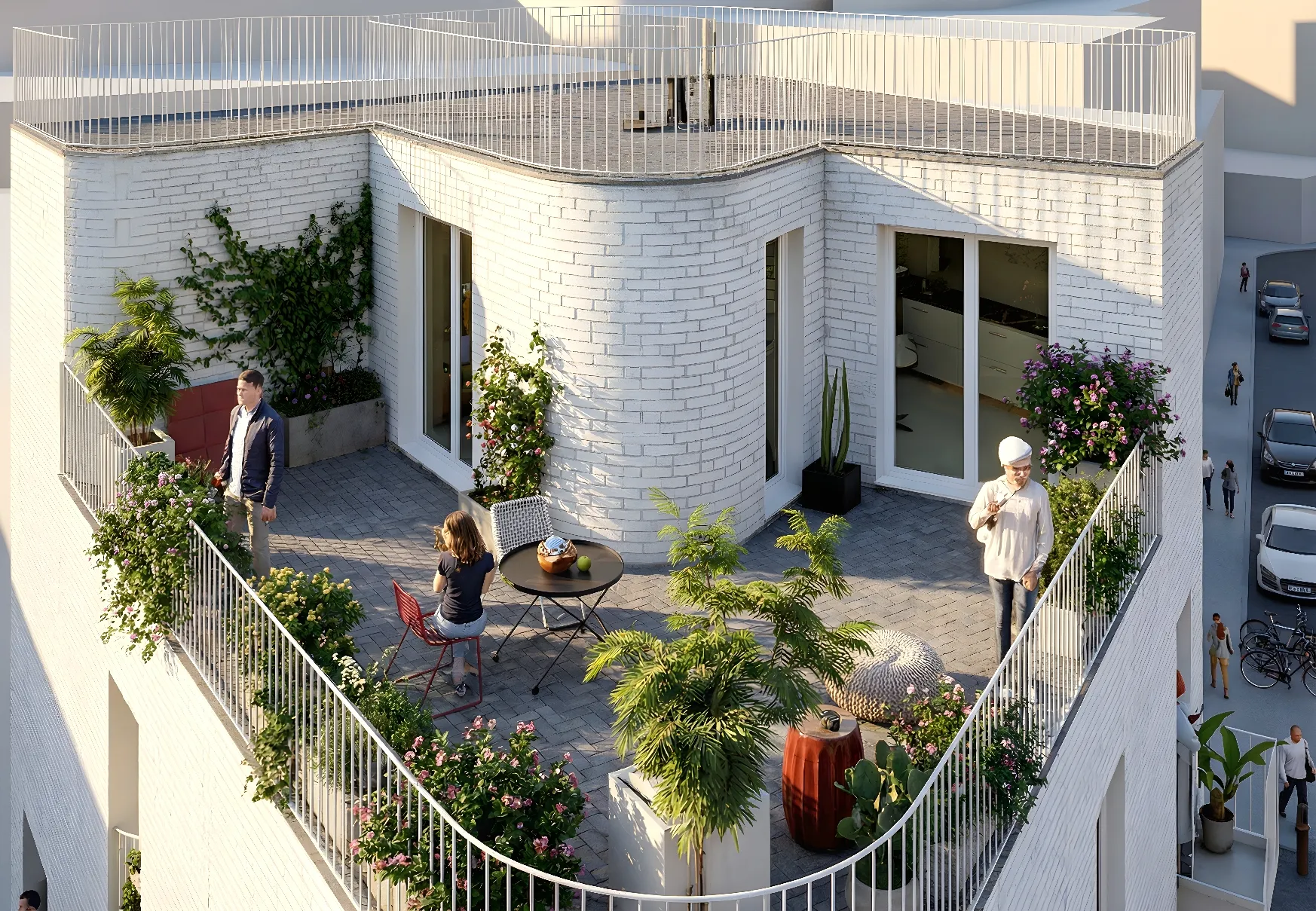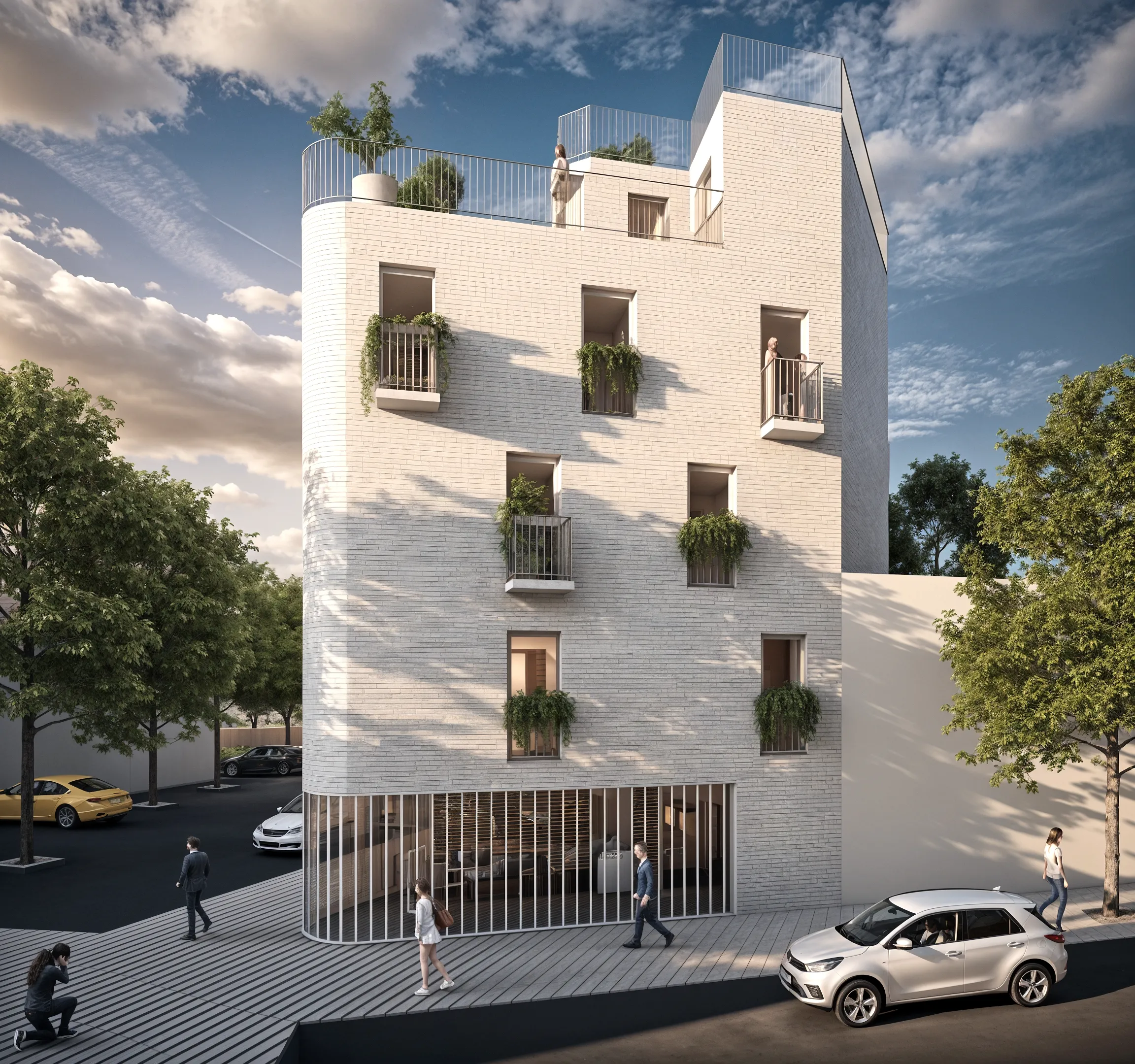 Este coliving de 11 habitaciones se concibe como un volumen compacto y reconocible, con una imagen contemporánea y atemporal. La fachada de ladrillo claro, los huecos profundos y los balcones individuales aportan una presencia urbana sobria y doméstica, alejándose del modelo de residencia impersonal. Es una arquitectura pensada para envejecer bien, con bajo coste de mantenimiento e integración de espacios vegetales. Cada habitación dispone de balcón exterior, garantizando iluminación natural y ventilación directa. Todas incorporan baño completo para asegurar privacidad total, así como una zona de estudio y trabajo integrada, adaptada a las dinámicas actuales de teletrabajo y estudio. Las zonas comunes se conciben como auténticos espacios habitables. Cocina comunitaria, áreas de estar y espacios flexibles se organizan sin pasillos innecesarios, optimizando la superficie útil. Estos espacios se prolongan hacia una amplia terraza comunitaria en cubierta, transitable y ajardinada, pensada para descanso, trabajo informal y socialización.