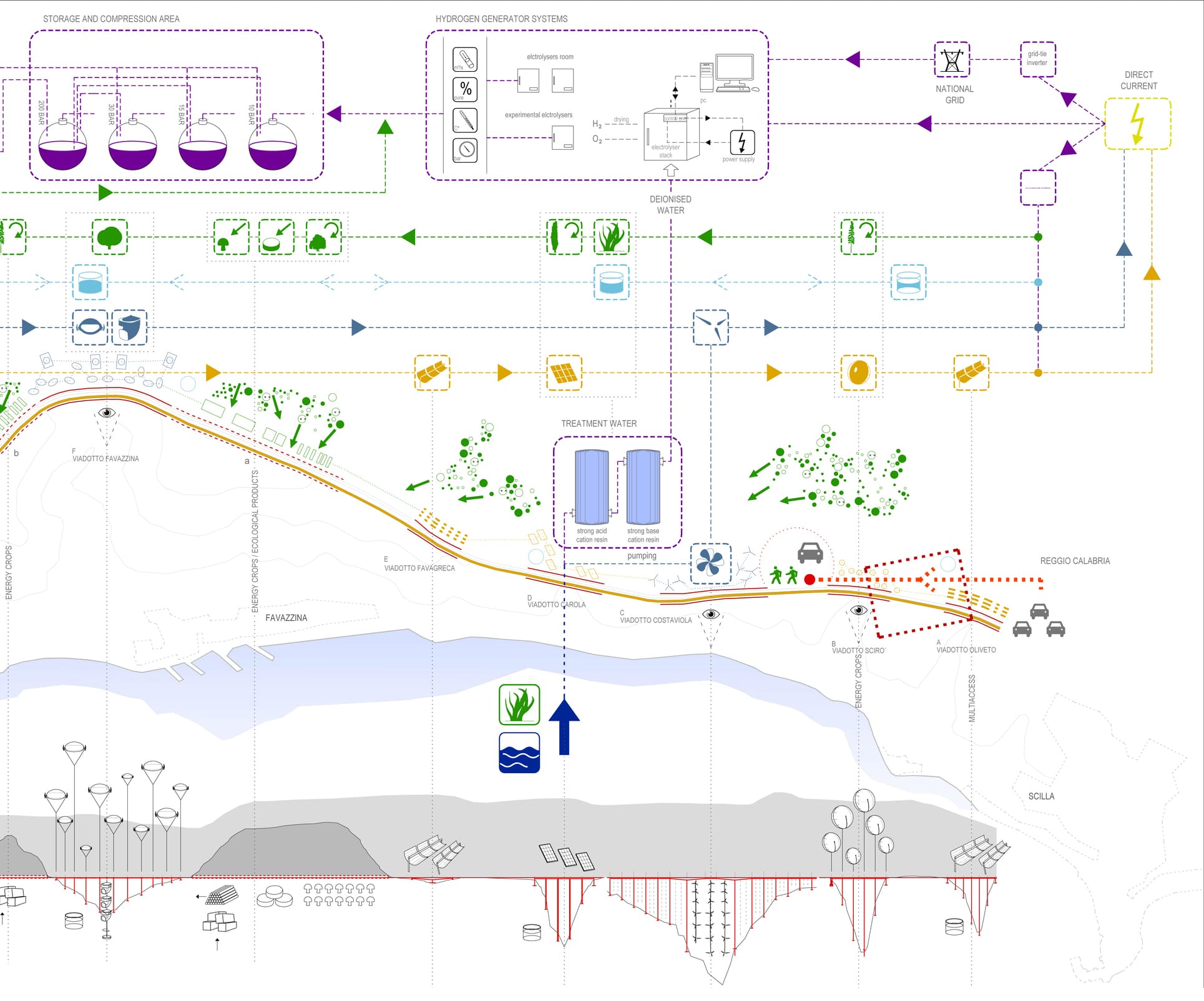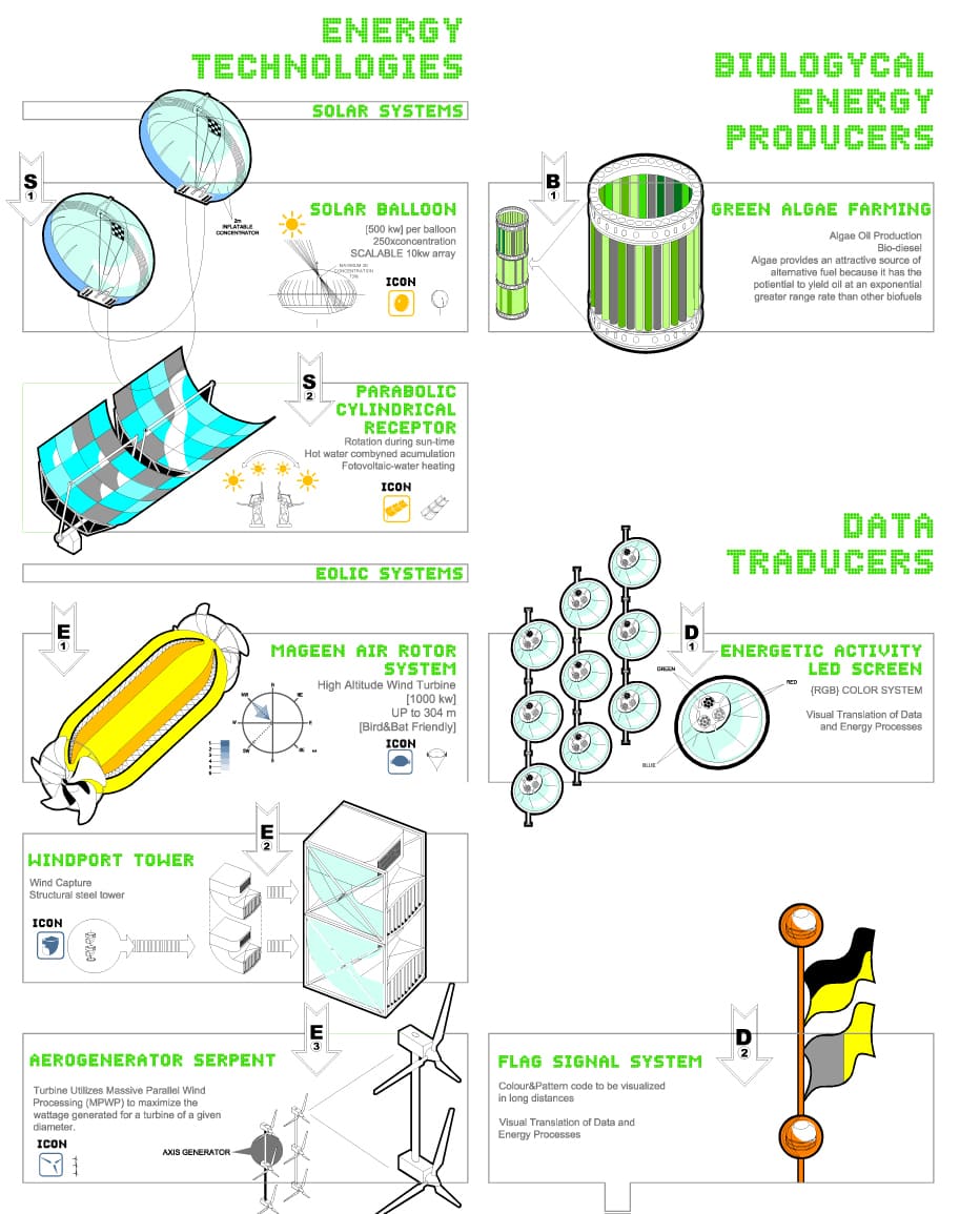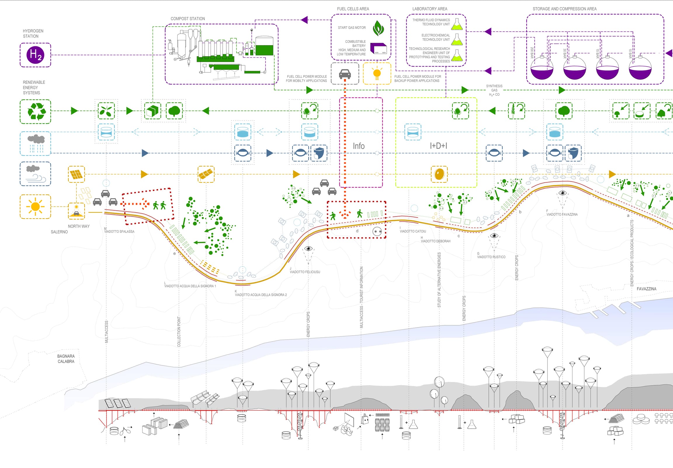Proyectos de urbanismo sostenible, arquitectura y ecología. Como respuesta al concurso de urbanismo para el desarrollo de un parque en la región de Calabria no propusimos un conjunto de planos, sino un conjunto de herramientas metodológicas. Estas nos permitían leer un territorio cualquiera de la manera más concreta y objetiva posible con el fin de obtener conclusiones científicas para el desarrollo urbano, la implantación del uso y la utilización de recursos. Mediante un proceso lineal que nos permite estudiar y relacionar todos los datos que considerábamos relevantes, redibujamos el territorio siguiendo un sistema de coordenadas bidimensional. Abordamos arquitectura y ecología desde una metodología científica.